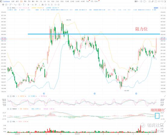 COIN整体处在中期震荡上行趋势中,当前股价刚刚触及布林线上轨(约295美元),是一个阶段性压力位;MACD刚刚翻红,但动能一般;上方有前期套牢区,300是关键阻力,不建议追高,如果回踩不破260,甚至是275站稳,也是不错的低吸点。