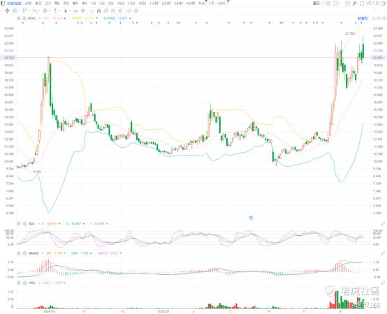 这只股前期走得很猛,从10元附近一口气最高涨到22.75元,现在价格在20元附近,看着变化不多,其实很关键——是洗盘蓄势还是见顶回落,看得就是这个阶段。技术面上看,布林带张口后开始趋缓,股价贴着中轨和上轨之间震荡,说明短期还在强势结构中;MACD虽然高位但没有死叉,但柱子缩短,动能减弱但不至于崩。如果能放量突破22.75,行情大概率还有一波上行;如果跌破布林带中轨18.5附近,就要小心了。