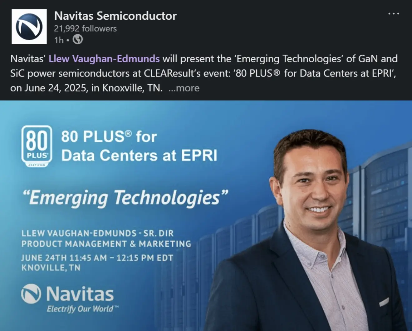$纳微半导体(NVTS)$ 各位注意啦,$纳微半导体(NVTS)$ 下周二(6月24日)要在田纳西州搞大动作!当天他们技术大牛Llew将在CLEAResult主办的数据中心研讨会上,大谈氮化镓和碳化硅这些黑科技怎么让数据中心更省电。这波操作要是成了,说不定能改写行业游戏规则?