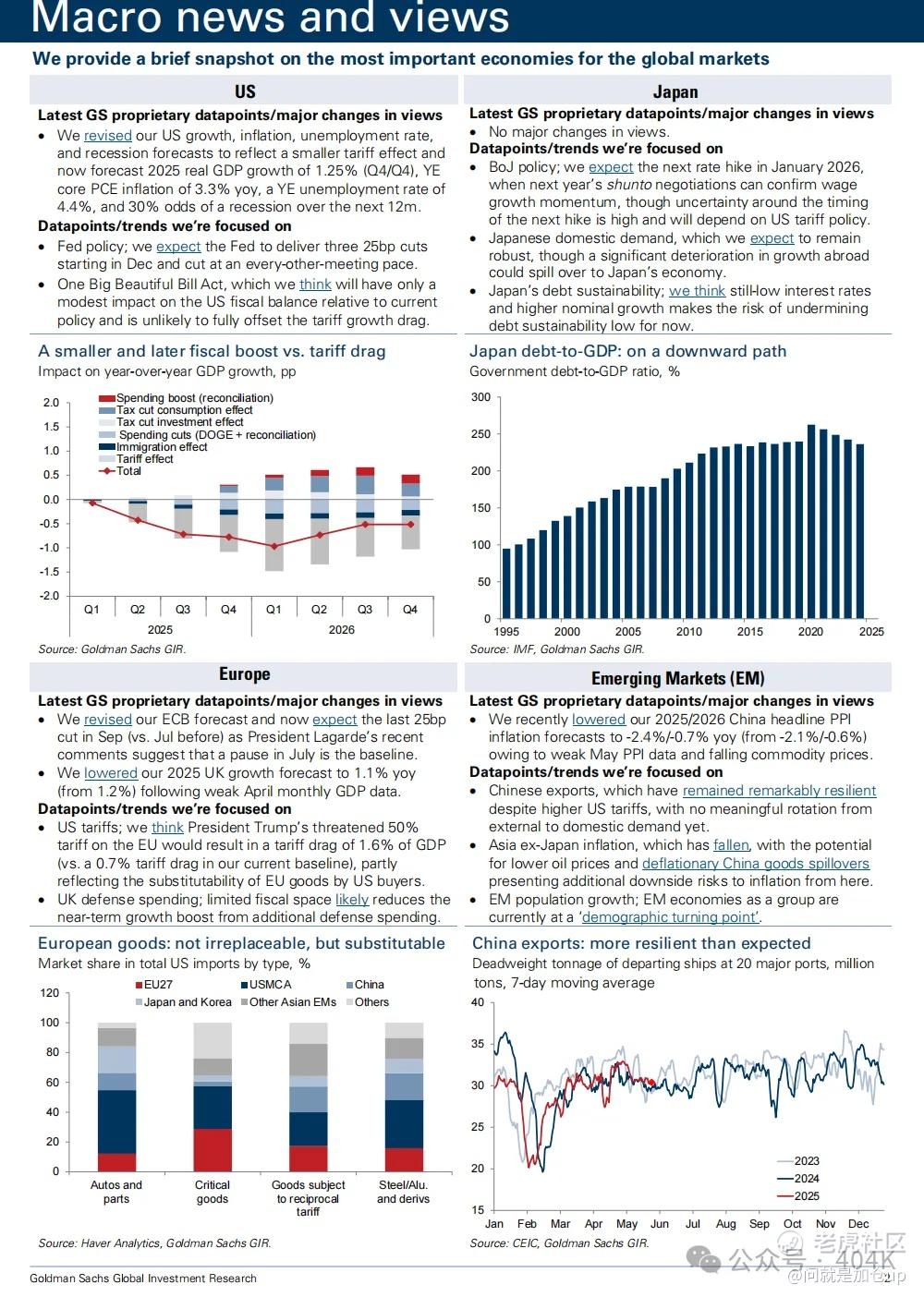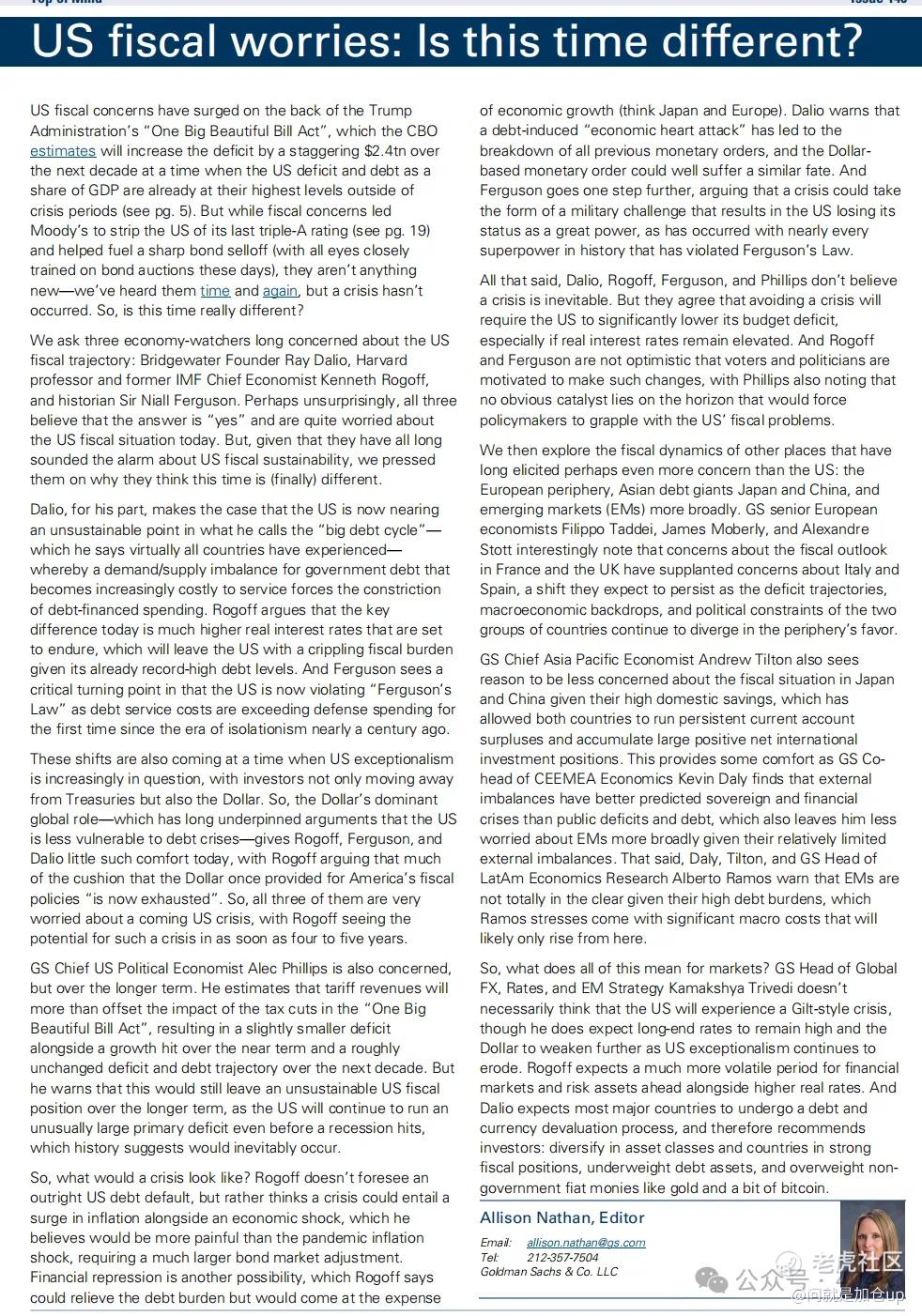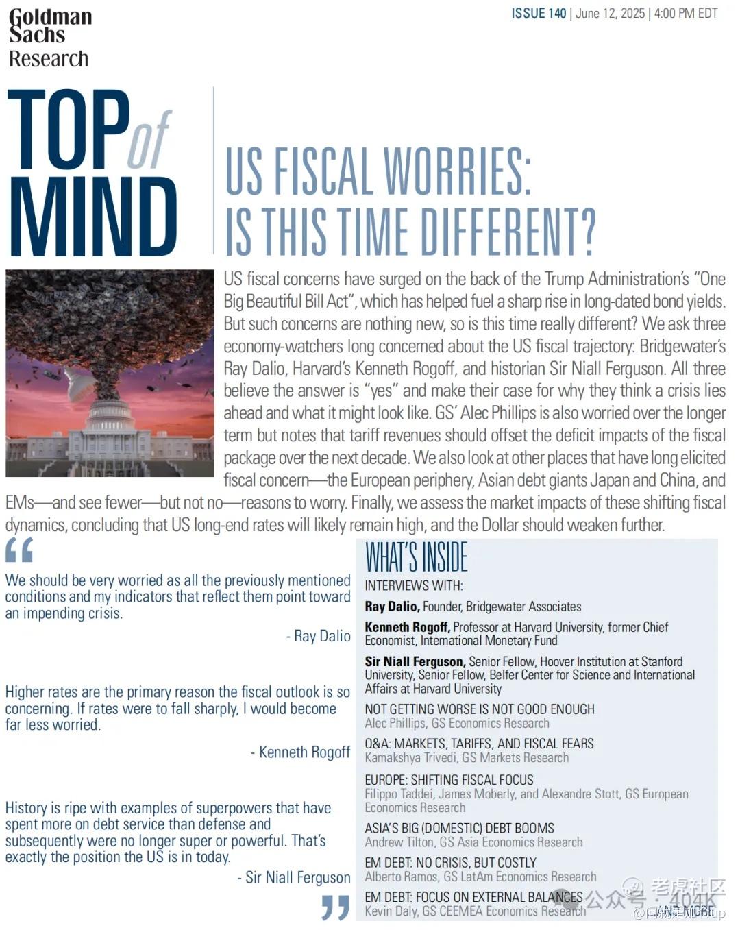 美国财政担忧因特朗普政府的 “一项伟大而美妙的大法案(One Big Beautiful Bill Act)” 而急剧升温,该法案已助推长期国债收益率大幅攀升。但类似的担忧并非第一次出现——那么,这一次真的有所不同吗?我们采访了三位长期关注美国财政轨迹的经济观察者:桥水基金创始人 雷·达里奥(Ray Dalio)、哈佛大学教授兼前 IMF 首席经济学家 肯尼斯·罗格夫(Kenneth Rogoff),以及历史学家 尼尔·弗格森爵士(Sir Niall Ferguson)。三人均认为答案是“是”,并阐述了他们认为危机即将到来以及可能形态的理由。高盛美国经济学家 Alec Phillips 同样对长期前景表示担忧,但指出关税收入应当能在未来十年抵消该财政方案对赤字的影响。 我们还审视了历来引发财政担忧的其他地区——欧洲外围、亚洲债务巨擘 日本,以及 新兴市场(EM)——发现理由虽少但仍存在,不容忽视。最后,我们评估了这些财政动态变化对市场的影响,得出结论:美国长端利率大概率维持在高位,而美元应会进一步走弱。