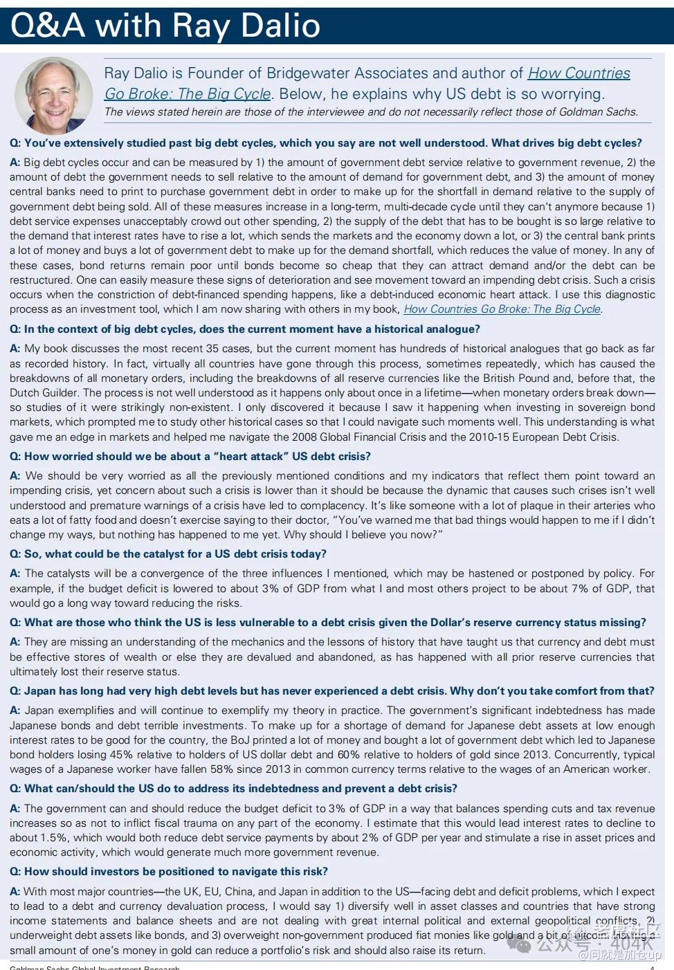 问: 美国应当如何应对债务问题并避免危机? 答: 政府可以也应当将预算赤字降至 GDP 的 3%,通过平衡削减支出和增加税收实现,不给经济任何部门造成财政创伤。我的估算是,这将使利率降至约 1.5%,每年可减少约 2% GDP 的利息支出,并刺激资产价格和经济活动上升,从而带来更多政府收入。