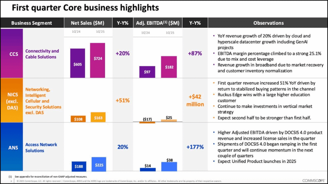 下图:COMM 在 2025 年第一季度的收入和利润均超出预期,这得益于包括 GenAI 项目在内的云和超大规模数据中心的增长。