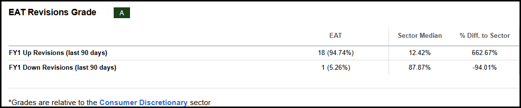 下图:在过去 90 天内,华尔街分析师有 18 位分析师上调了收入,只有一次下调,EAT 展示了 20% 的同比收入增长,而该行业为 2%