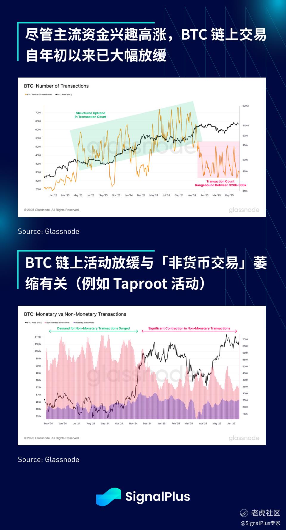 Glassnode 上周进行了一项出色的分析,显示尽管 TradFi 社群对 BTC 表现出浓厚兴趣,链上交易活动却已显著放缓。简言之,由于主流投资者试图透过传统工具(例如 ETF、期货)获取 BTC 敞口,链下场外(OTC)交易活跃,然而自 FTX 以来,链上活动并未恢复,这从 DeFi 与 Altcoin 表现低迷以及新叙事(除稳定币/RWA 外)乏善可陈的现象中可见一斑。