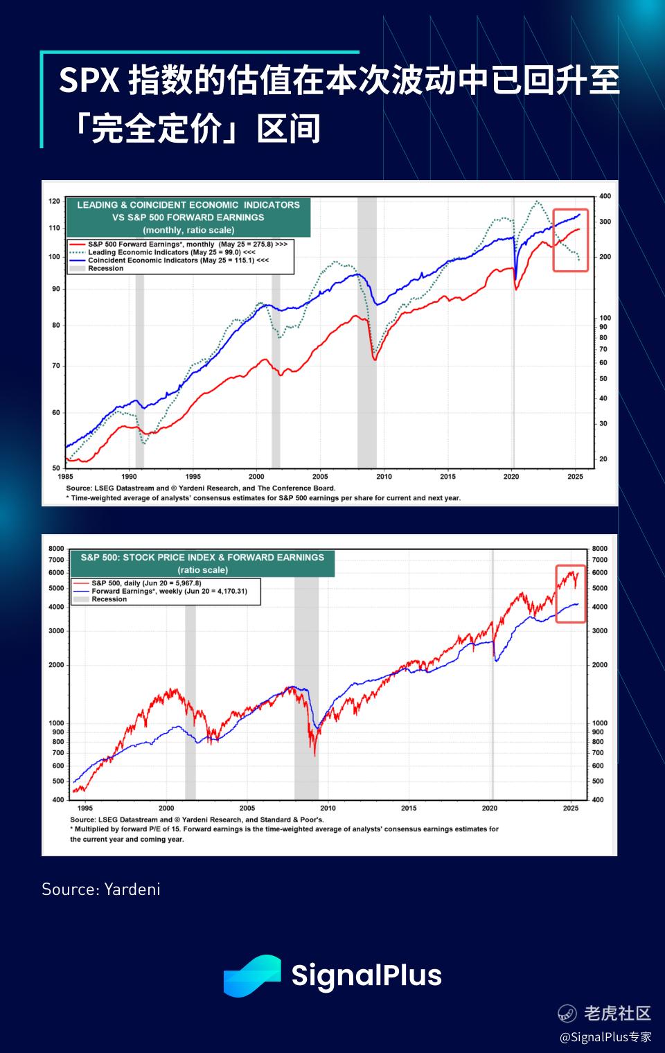 展望未来,我们认为市场将很快消化并走出此次地缘政治事件,甚至可能看到俄罗斯与伊朗局势都出现某种和平突破,以及关税谈判的实质进展。市场自然会因这些进展而上涨,但届时焦点也将重新回到高估值问题上,目前 SPX 指数已经反映 + 12% 的盈利增长预期至 296 美元(相当于 20 倍远期市盈率),然而美国经济实际上似乎正在放缓(就业指标、CEO 裁员预期等)。