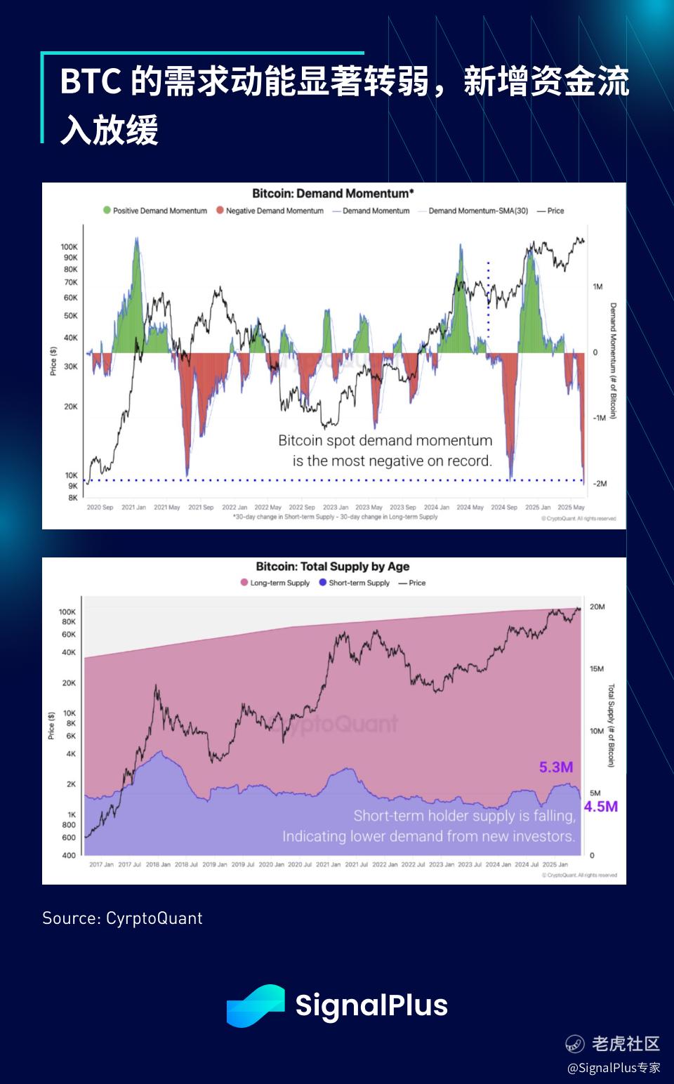 回到当前时点,BTC 的需求动能似乎显得疲弱。根据 CryptoQuant 的数据,其需求动能指数创下历史低点,即使市场拥有一连串利多政策(如 Genius Act、香港稳定币政策等),价格依旧无法有效突破先前高点,短期持币者(即新资金)供给似乎正在放缓。