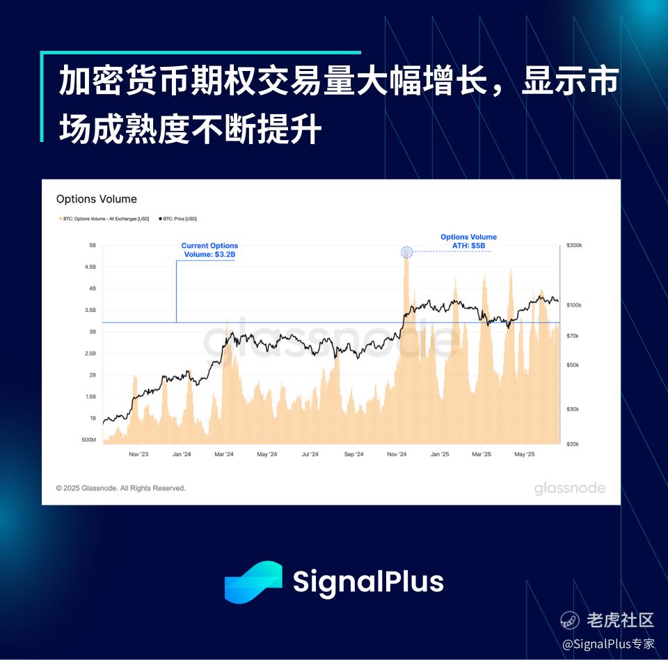 与此同时,本轮周期中加密货币期权交易活跃度也显著上升。整体市场每日交易量从 2024 年的 15 亿美元攀升至近期高点 50 亿美元,显示日益成熟的市场参与者采用更多期权策略来管理风险。欢迎持续与 SignalPlus 团队联系,我们将竭诚协助您探索更多期权策略应用!