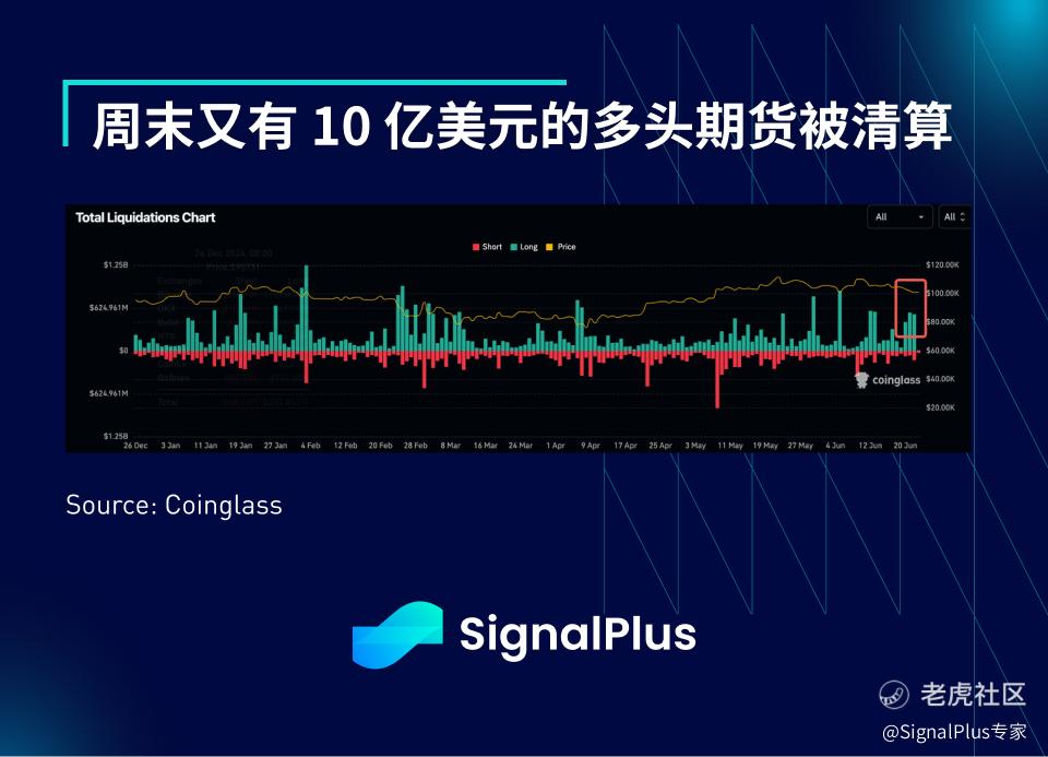 可惜的是,加密货币市场并非如此。BTC 下跌 4% ,触及 98.9 k 美元附近,而 ETH 则大跌约 10% 至 2, 150 美元,创下自 5 月初以来最低的盘中价位。随著伊朗空袭消息传出,加密货币作为唯一仍在交易的资产,自然遭到抛售,周末期间有超过 10 亿美元的期货部位遭到清算。