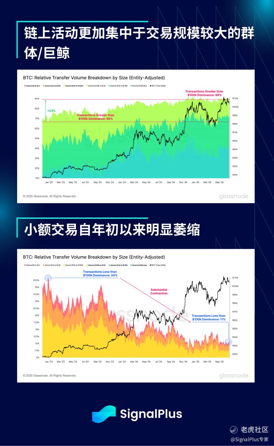 同样地,幂律分布现象在加密货币领域也愈发普遍,一方面,BTC 的市值主导地位持续上升,另一方面,其自身的链上转帐活动也愈发集中于大型钱包。根据 Glassnode 的数据,单笔金额超过 10 万美元的交易占比已从 2022 年的 66% 上升至今日的 89% ,进一步证实了「巨鲸」主导市场的观点,而小型帐户在市场上的影响力与参与感也越来越低。