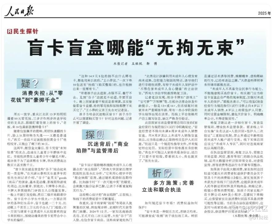 6月20日,《人民日报》发表文章《盲卡盲盒哪能“无拘无束”》指出,这两年,继盲盒火爆后,盲卡凭借“未知惊喜”的卖点,迅速在儿童青少年群体中走红。非理性消费在儿童青少年中屡见不鲜,部分孩子为了追求稀有卡牌,单次消费高达数百元甚至数千元。如今,盲卡早已超越简单的收藏功能,变成儿童青少年社交圈里的“硬通货”。而在未成年人沉迷的背后,也存在“商业陷阱”与监管滞后的问题。