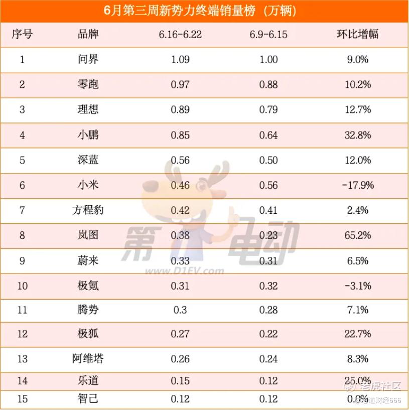 新一周(6月16日-6月22日)新势力的周销量出炉,新能源汽车终端市场延续增长态势,多家品牌销量实现显著提升。