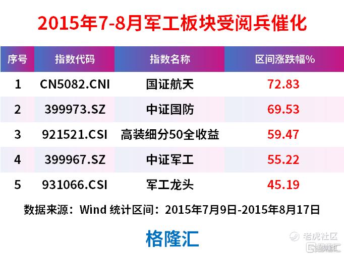 回溯历史规律,阅兵前1-2个月军工板块通常出现主题行情,以2015年的世界反法西斯战争胜利70周年大阅兵为例,7月9日起军工板块行情受阅兵的催化,8月17日达到最高点,航空航天ETF天弘(159241)跟踪国证航天指数凭借72.83%的涨幅位居同类军工类指数第一。