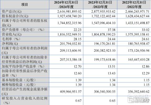 业绩方面,2022年、2023年、2024年(简称“报告期”),南方乳业的营收分别约15.75亿元、18.05亿元、18.17亿元,归母净利润约1.73亿元、2亿元、2.09亿元,毛利率分别为24.61%、24.44%、28.15%。