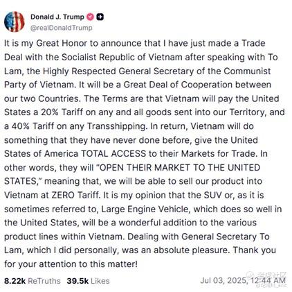 昨晚美股盘中,特朗普宣布美国与越南达成了贸易协议,从上一次中美贸易战开始,大量品牌的代工工厂迁往越南,使得越南作为中国之后的第二大“世界工厂”,这份贸易协议也是近期最受关注的之一。