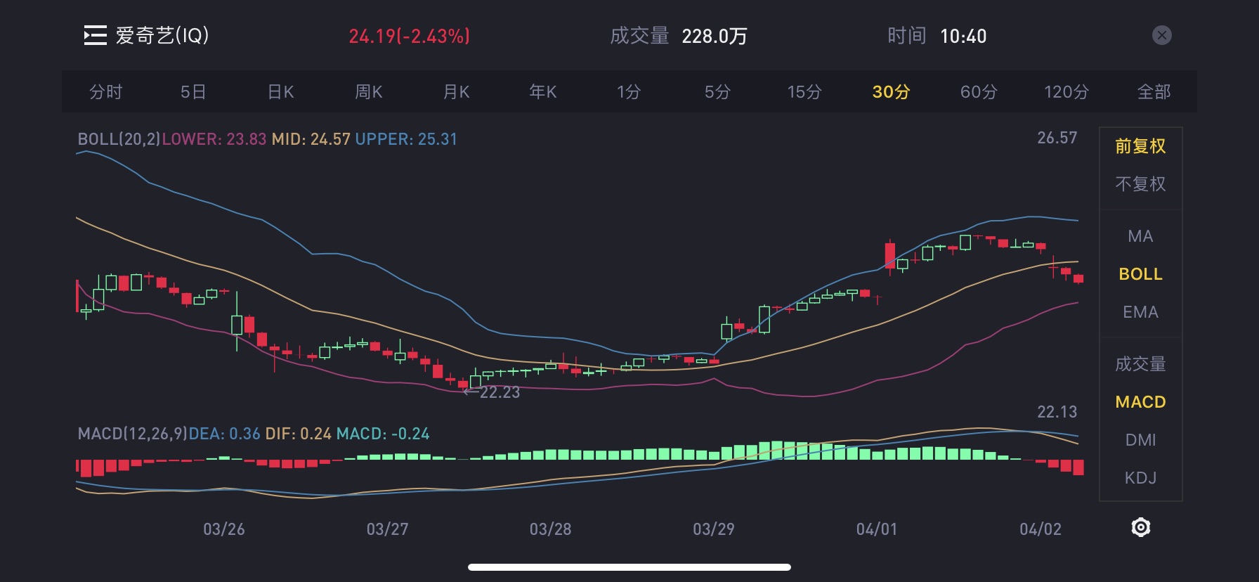 $爱奇艺(IQ)$ 跌破30分布林线,做空,这周主要看涨,空仓可能今晚或者明早平。