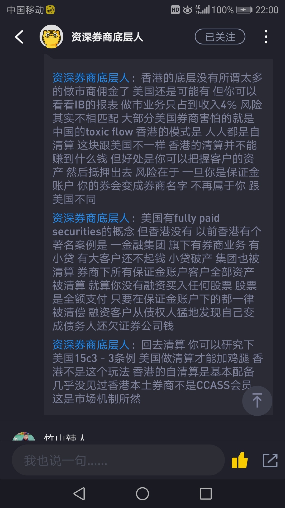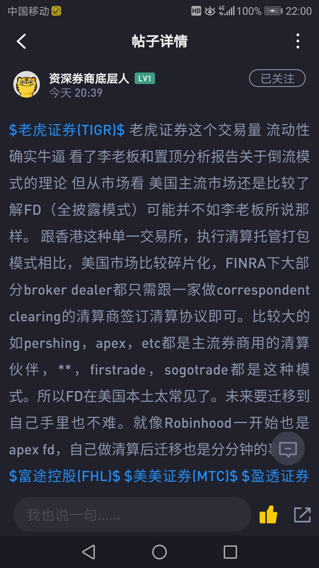 今天早晨醒来,头脑比较清醒,重新读了@资深券商底层人,的精辟言论,简直茅塞顿开。美国的券商确实多如牛毛,我查了一下好像全国5000多家券商。很多券商都是全披露模式。老虎也是全披露模式。清算是委托给大券商或者清算商。问题是:Robinhood做大以后为什么自己做清算了,其实还是因为清算里面很大一块利润,作为一个想要发展壮大的券商来说,清算牌照是早晚都要拿到的。李老板的危机意识非常强。