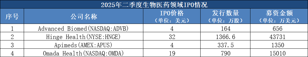 2025年二季度,在生物医药领域,有4家公司采取IPO形式上市,1家公司采取DPO方式上市,2家公司宣布SPAC上市,9家公司宣布借壳上市。