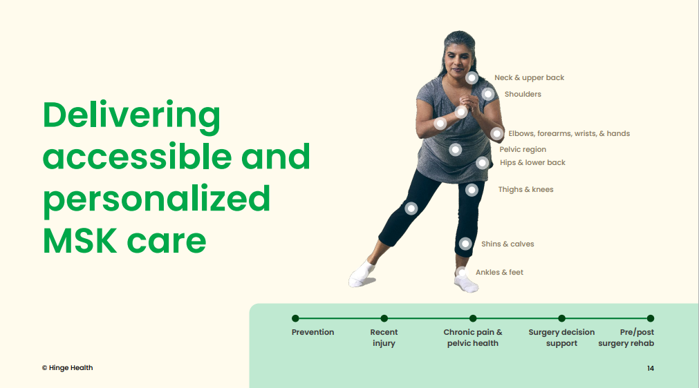 Hinge Health最早成立于2012年1月,源于由Daniel Perez和Gabriel Mecklenburg创立的Marblar。2014年,Marblar开启了膝盖和背部疼痛数字化康复项目, 将业务方向调整到MSK(肌肉骨骼疾病)健康问题。