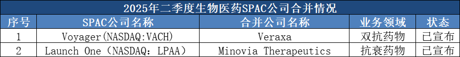 二季度,生物医药领域有1家公司宣布与SPAC公司的合并。今年以来,已有三家公司宣布SPAC上市:BridgeBio Pharma(NASDAQ:BBIO)旗下肿瘤业务公司BridgeBio Oncology Therapeutics、抗衰老药企Minovia与双抗药企Veraxa。