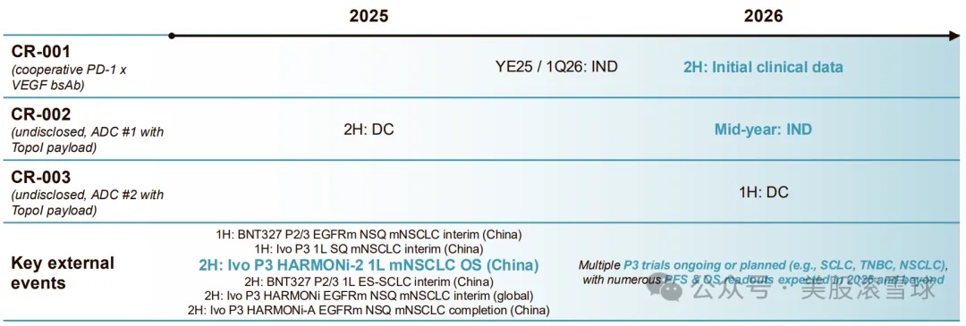 Crescent Biopharma是一家双抗药物公司,其领先的管线是一款四价PD-1 x VEGF双特异性抗体CR-001, 与康方生物的同靶点药物ivonescimab 具有“相同的设计”,预计将在2025年底或2026年初提交IND,并于2026 年下半年提供概念验证数据。