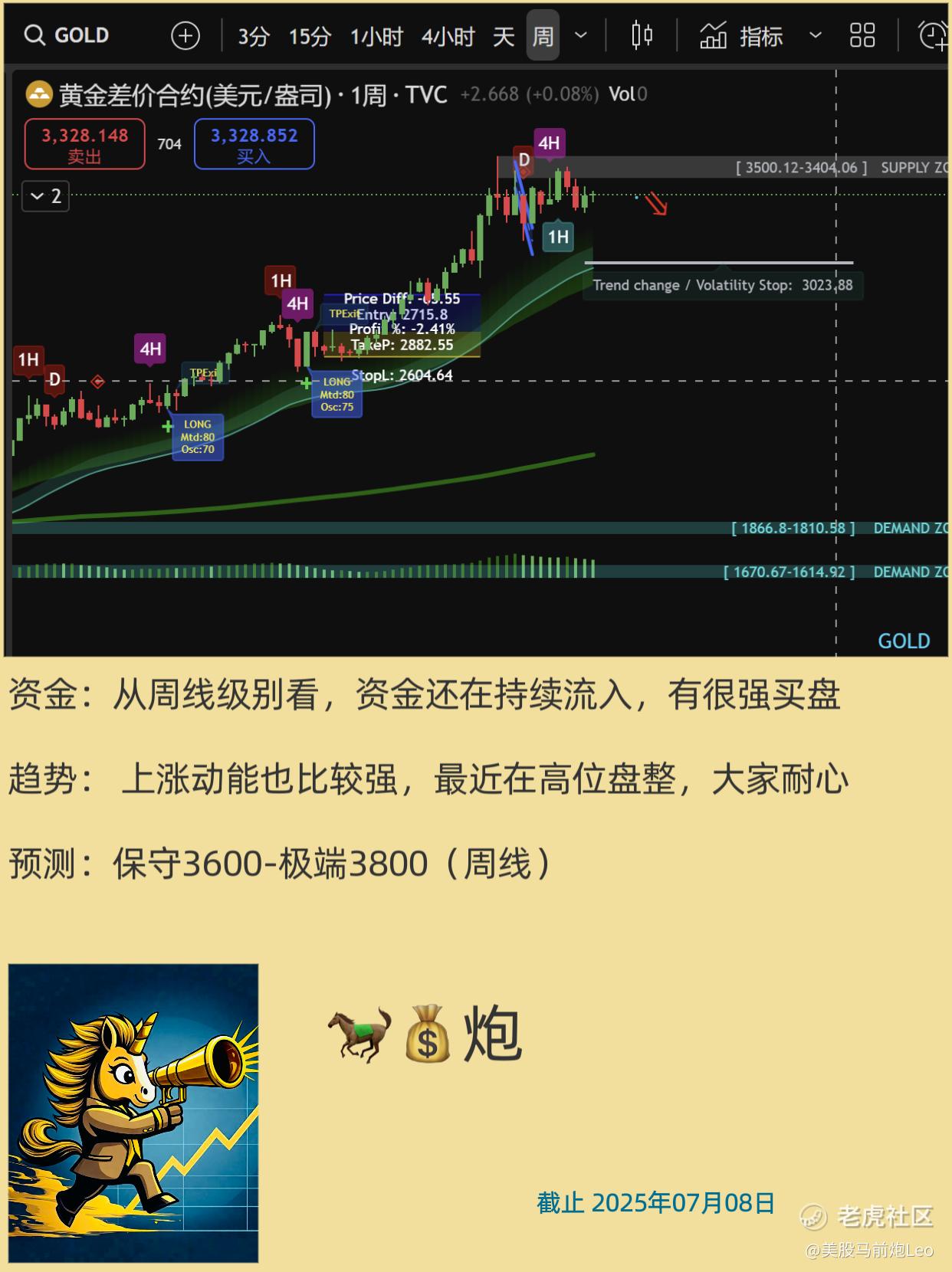 黄金从周线级别看,资金还是持续流入,有很强买盘,且上涨动能也比较强,最近在高位盘整,大家耐心,下半年随着美联储降息,防水加上美元贬值,3600是比较保守的位置,叠加特殊事件就可能上3800。