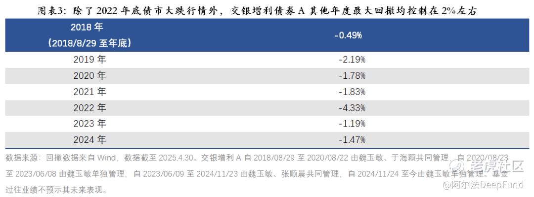 交银增利债券自魏玉敏2018年8月29日管理起,年度收益率超越业绩比较基准的占比为100%,七年中六年实现3.5%以上的年度回报,净值屡破前期高点,其回撤控制十分符合中低波“固收+”的定位。