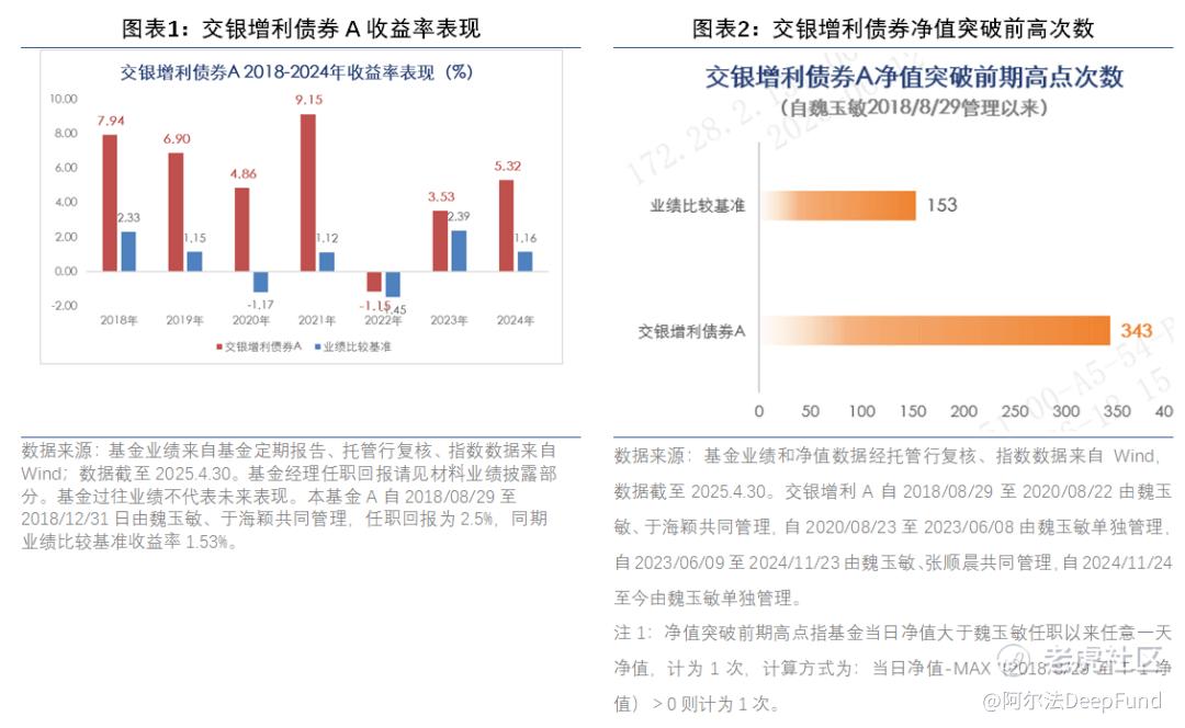 而在固收+产品领域,魏玉敏在管的两只代表产品交银增利债券、交银增利增强在过去几年表现出色,除了股债双杀的2022年收益录负,近5年均为正收益,真正践行了“力求为投资者获取绝对收益”的理念。