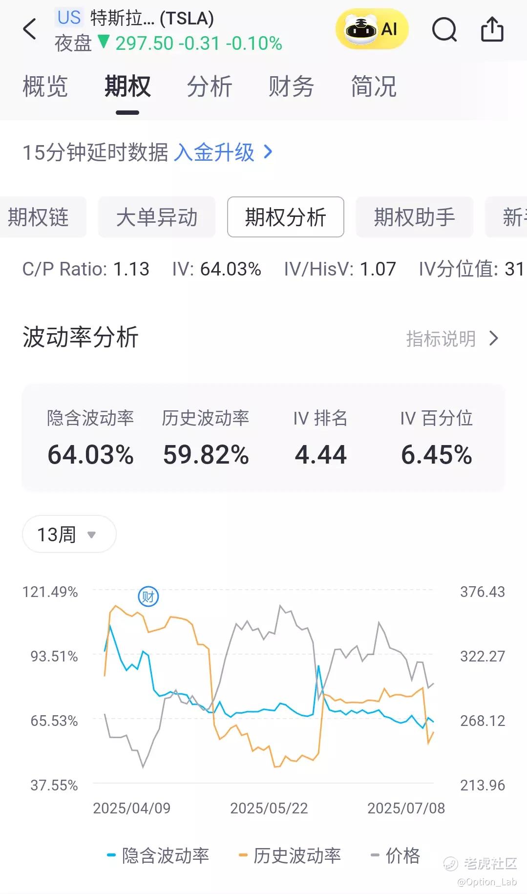 具体到某一张合约上,我们看见,特斯拉7月25日到期、行权价 $295 的 Call 合约,的 IV 和 HV 分别为 65% 和 60% —— IV/HV 大于1,也反映出这张期权偏贵。