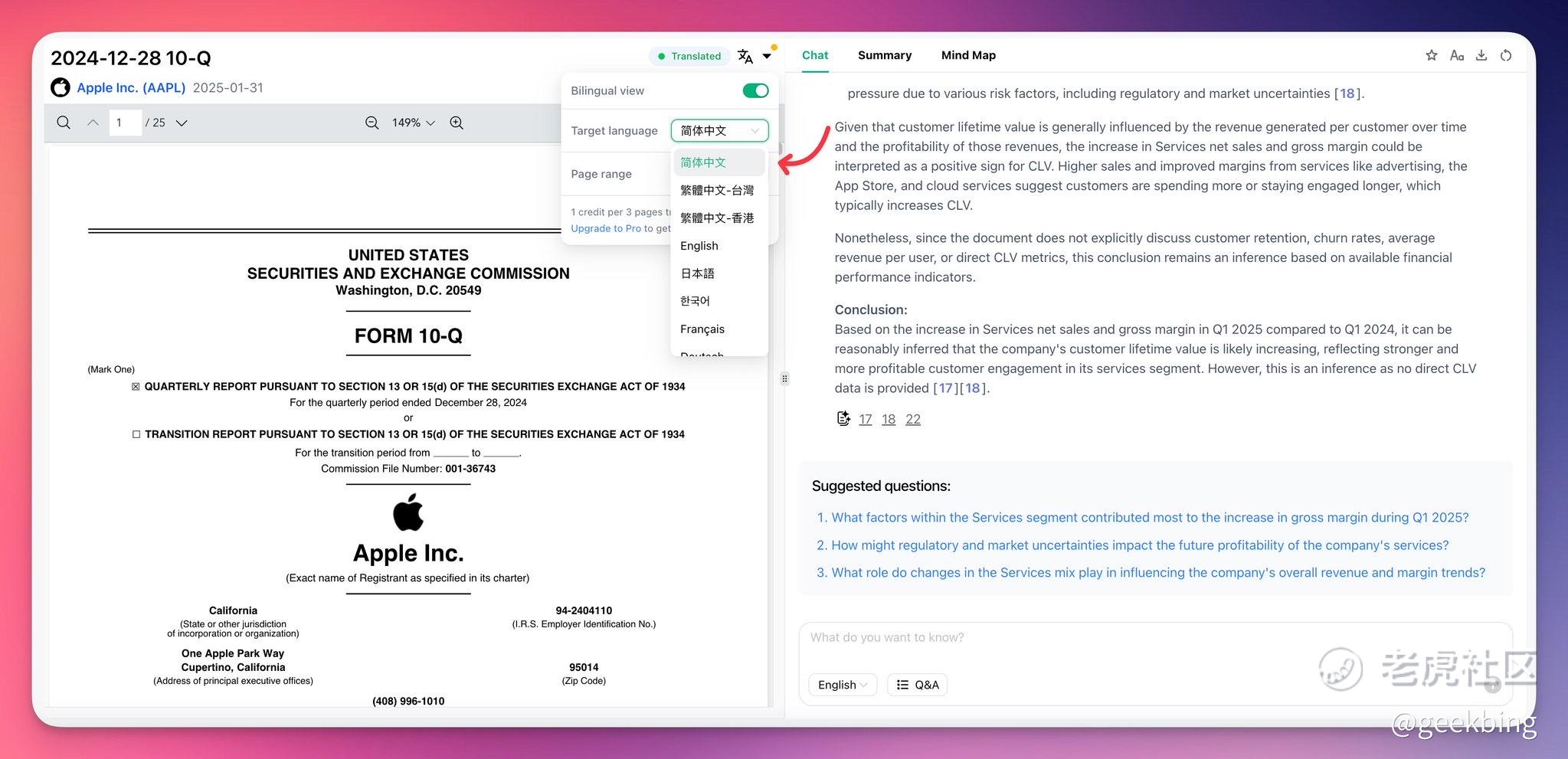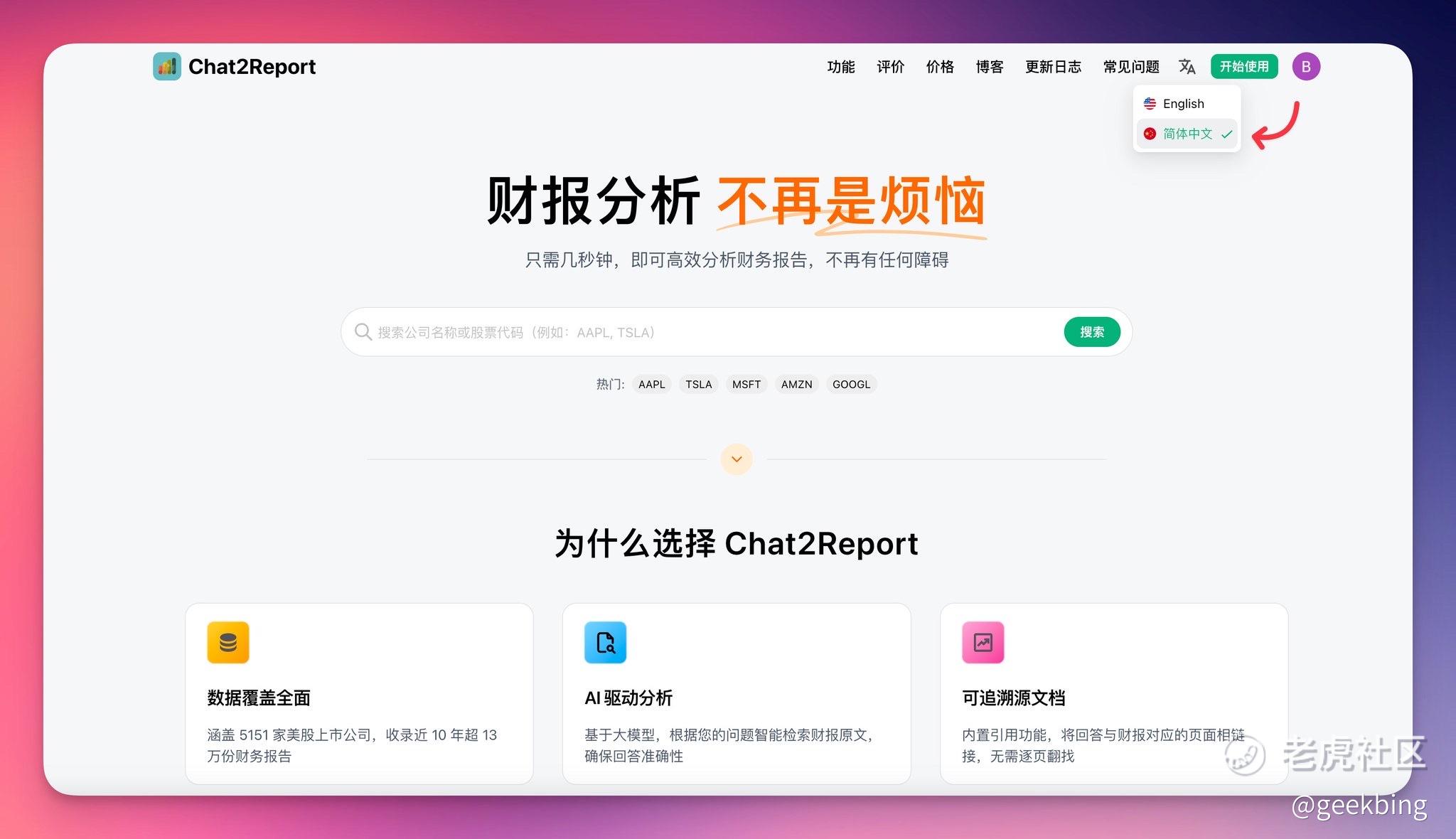 支持多语言 AI 翻译财报,自动保留文档格式,多个页面简体中文本土化,分析美股财报没有语言障碍了@Chat2Report