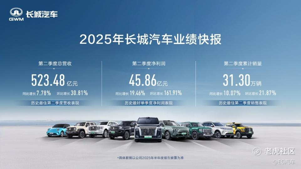 7月18日,长城汽车股份有限公司(股票代码:601633.SH,02333.HK,82333.HK;以下简称“长城汽车”)发布业绩快报。2025年第二季度,长城汽车营收523.48亿元,同比增长7.78%,环比增长30.81%,是历史最佳的第二季度营收表现;二季度净利润45.86亿元,同比增长19.46%,环比增长161.91%,是历史最好的单季度净利润表现。