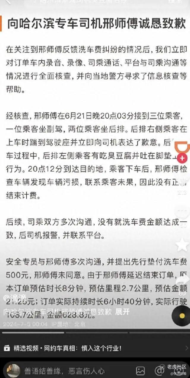根据大河网报道,2024年7月3日晚,哈尔滨一位滴滴专车司机邢师傅公开控诉称,自己在6月21日晚接到三名乘客,对方在车内恶意将臭豆腐嚼碎吐洒,并将汤汁、油脂涂抹车内多个部位,造成严重污染。由于试图保留与乘客联系的机会,邢师傅未及时结束订单,却因此被平台扣除服务分并降级为快车司机。