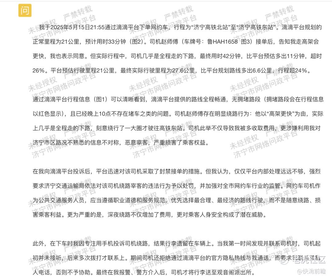 根据济南市网络问政平台,2025年5月15日,济南一乘客从济宁高铁北站至东站,司机以“走高架更快”为由全程绕行下路,实际里程超平台规划24%(多6.6公里),耗时增加26%。该乘客向滴滴平台投诉,滴滴平台封禁司机账号,但该乘客认为仅平台内部封禁不够,还需要交通局行政处罚对该司机绕路宰客的违法行为予以处罚,并加强对全市网约车行业的监管。