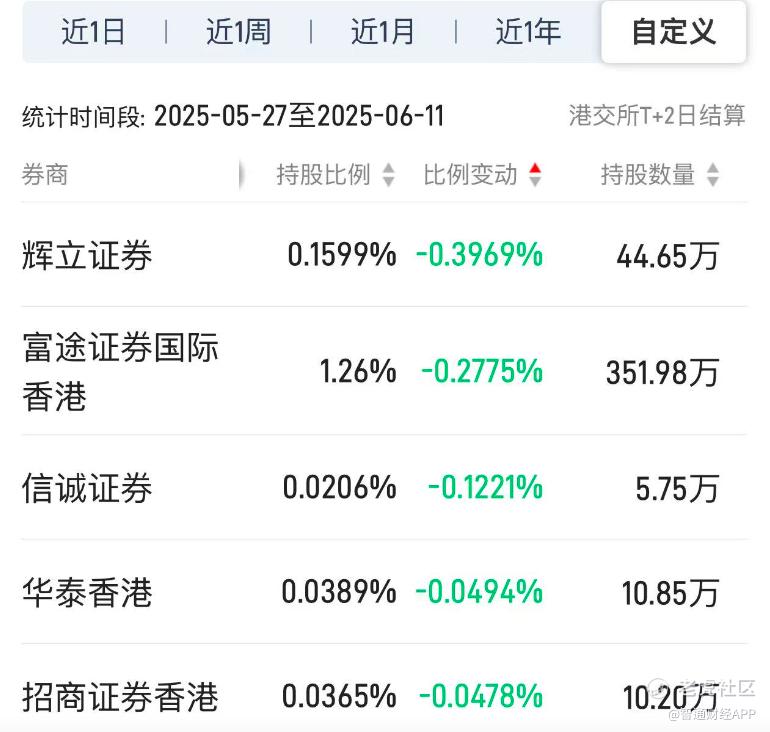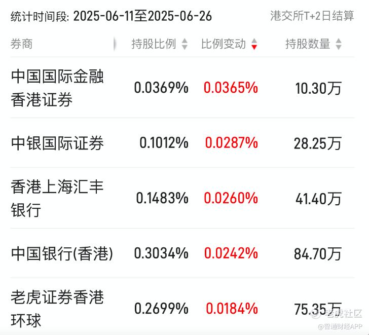 这一阶段,买入席位前五位分别为中国国际金融香港证券、中银国际证券、香港上海汇丰银行、中国银行(香港)及老虎证券香港环球,持股比例分别增加 0.0365%、0.0287%、0.0260%、0.0242% 及 0.0184%