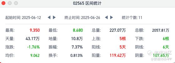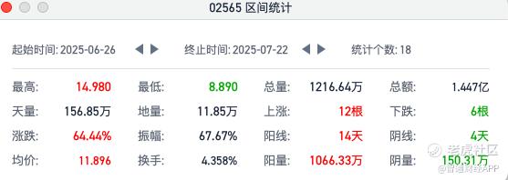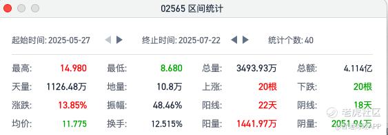 其三,从 K 线形态来看,多空力量均衡。上涨与下跌天数均为 20 天,阳线 22 天对阴线 18 天,看似平衡的背后隐藏着 13.85% 的净涨幅,这种 "平衡中的不平衡" 是典型的主力控盘特征,主力通过反复震荡清洗浮筹,避免形成单边趋势。
