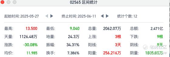 首先,大跌时期是 5 月 27 日至 6 月 11 日,股价从 13.5 高点下跌至最低点 9.04 港元。这一阶段,该股首日即破发,收盘跌 25.9%,成交量约 1126 万股,换手率为 4.04%,这表明大量中签投资者在首日抛售,导致股价承压,筹码快速分散。随后几个交易日,仍不改暴力砸盘风格,该股一路下跌,阴量 1805.85 万远超阳量 256.216 万(比例达 7:1),但换手率仅 7.386%,显示资金对倒打压明显,诱导散户交出筹码。