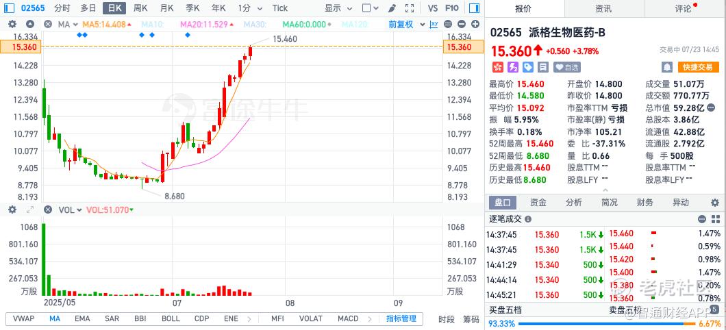 自 6 月 27 日至 7 月 22 日,该股一改上市以来下跌,反而一路上扬,涨幅近 66%。截至 7 月 23 日收盘,该公司收报 15.44 港元,几乎接近发行价 15.6 港元,总市值约为 59.59 亿港元。