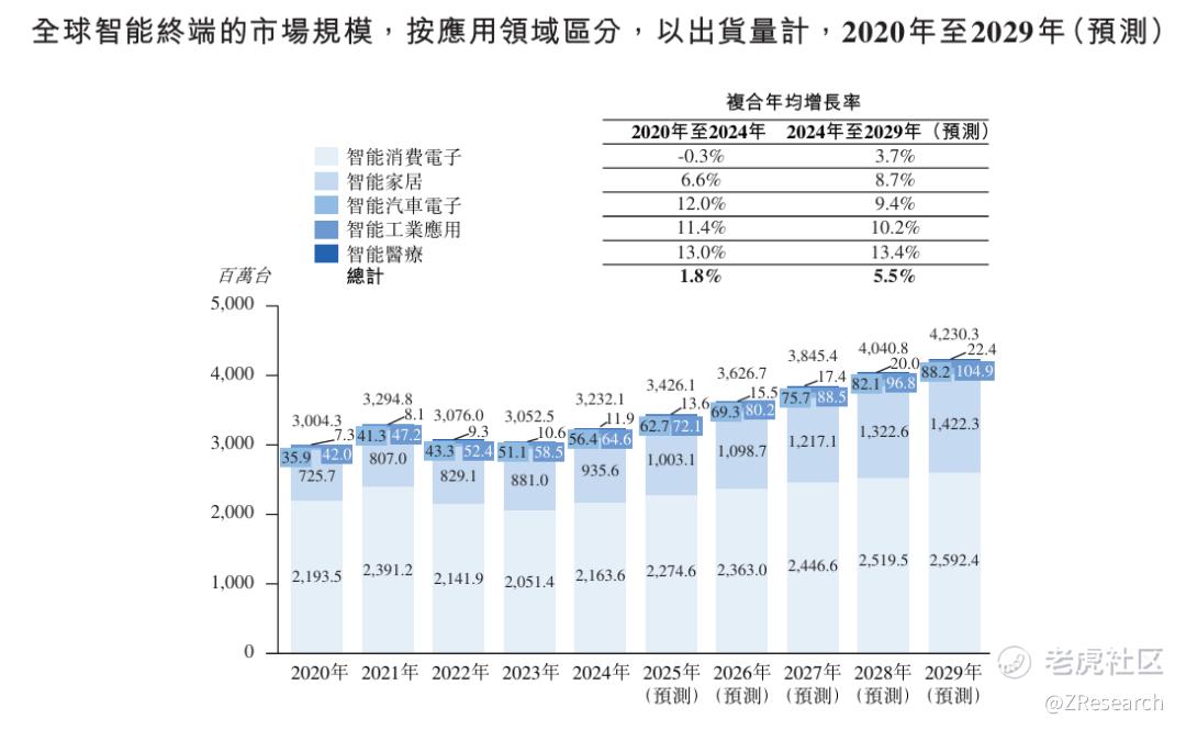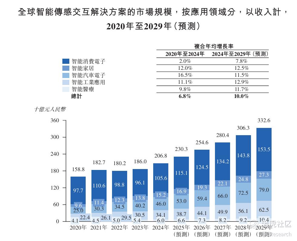 2、智能传感交互解决方案行业:全球智能传感交互解决方案市场总规模呈增长趋势,2020-2024 年从 1,588亿元增长至2,068 亿元,复合年均增长率 6.8% ;2024-2029 年预计增至3,326亿元,复合年均增长率提升至10.0%。细分领域中2020-2024年智能汽车电子复合年均增长率16.5%变化最快;2024- 2029年(预测)智能医疗领域复合年均增长率 11.7% 、智能工业应用 12.9%等,智能医疗领域预计变化最快 ,反映出不同阶段各领域因市场需求等因素驱动,增长速度有差异,且未来医疗、工业等领域对市场扩张支撑作用显著。