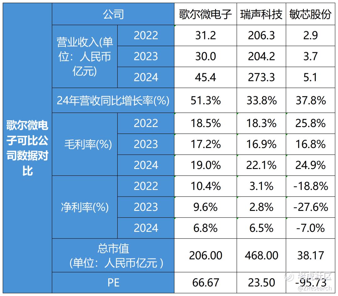 从估值上看,根据歌尔微最后一次融资的对价和股份计算,其估值约为206亿元人民币左右,考虑2024年的净利润,其PE倍数约为66X,显著高于瑞声科技的23X估值,由于24年敏芯股份加大研发投入以及订单增加而加大销售投入导致净利润水平为负,所以24年其PE估值为负。