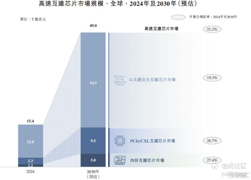 2024年全球高速互连芯片市场规模为154亿美元,预计将在2030年进一步将增长至490亿美元,年均复合增长率为21.2%;