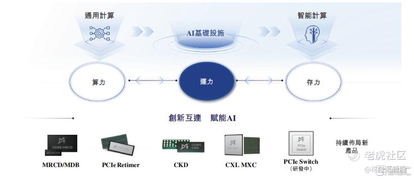 其中,互连类芯片主要包括内存接口芯片(包括RCD及DB)、内存模块配套芯片(包括SPD、PMIC及TS)、高性能运力芯片解决方案(包括MRCD及MDB芯片、CKD芯片、PCIe Retimer及CXLMXC)及时钟芯片。