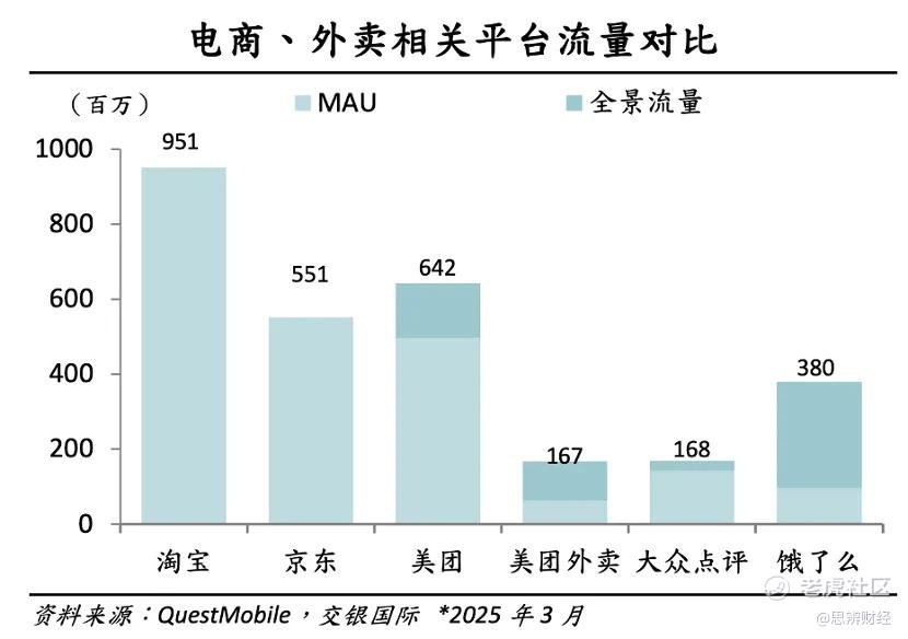 根据交银国际数据,2025年3月淘宝MAU接近10亿,饿了么接近4亿,两大平台接近有14亿的MAU(未排除重复用户),京东有5.5亿之多。新的平台介入外卖市场后,会对行业带来更的增长变量。