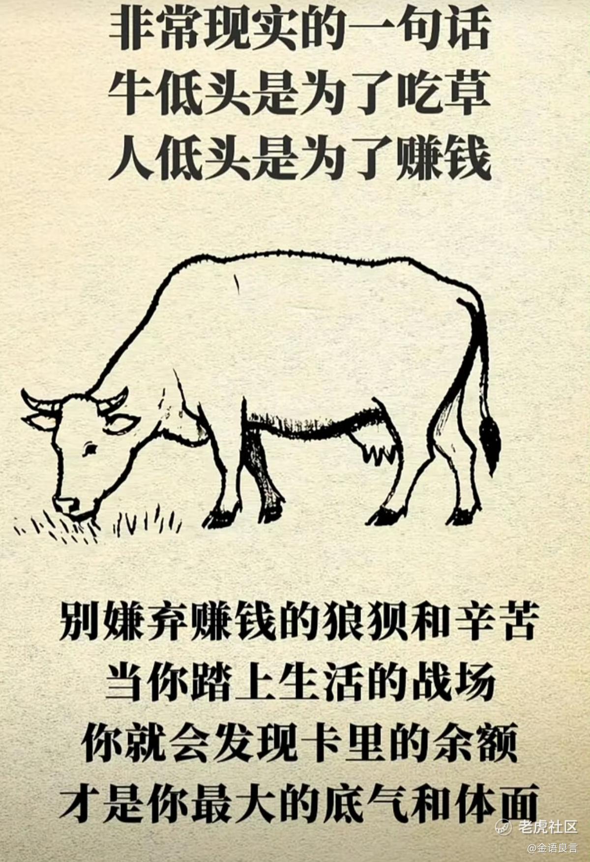 {"i18n":{"language":"zh_CN"},"detailType":1,"isChannel":false,"data":{"magic":2,"id":462056697549080,"tweetId":"462056697549080","gmtCreate":1753825422660,"gmtModify":1753825621694,"gmtUserModify":1753825619517,"author":{"id":3569199766678800,"idStr":"3569199766678800","authorId":3569199766678800,"authorIdStr":"3569199766678800","name":"金语良言","avatar":"https://static.tigerbbs.com/dbfacd5a49b3f8d0004974631dc02f19","vip":1,"userType":1,"introduction":"","boolIsFan":false,"boolIsHead":false,"crmLevel":5,"crmLevelSwitch":0,"currentWearingBadge":{"badgeId":"35ec162348d5460f88c959321e554969-2","templateUuid":"35ec162348d5460f88c959321e554969","name":"宗师交易员","description":"证券或期货账户累计交易次数达到100次","bigImgUrl":"https://static.tigerbbs.com/ad22cfbe2d05aa393b18e9226e4b0307","smallImgUrl":"https://static.tigerbbs.com/36702e6ff3ffe46acafee66cc85273ca","grayImgUrl":"https://static.tigerbbs.com/d52eb88fa385cf5abe2616ed63781765","redirectLinkEnabled":0,"hasAllocated":1,"isWearing":1,"stampPosition":0,"hasStamp":0,"allocationCount":1,"allocatedDate":"2025.08.01","exceedPercentage":"80.63%","individualDisplayEnabled":0},"individualDisplayBadges":[],"fanSize":3,"starInvestorFlag":false},"themes":[],"images":[{"img":"https://static.tigerbbs.com/6232bbce0891454b25ffc8d3e035035c","width":"1200","height":"1751"}],"coverImages":[{"img":"https://static.tigerbbs.com/6232bbce0891454b25ffc8d3e035035c","width":"1200","height":"1751"}],"html":"<html><head></head><body><p>非常现实的一句话</p>\n<p>牛低头是为了吃草</p>\n<p>人低头是为了赚钱</p>\n<p>别嫌弃赚钱的狼狐和辛苦</p>\n<p>当你踏上生活的战场</p>\n<p>你就会发现卡里的余额</p>\n<p>才是你最大的底气和体面</p><img src=\"https://static.tigerbbs.com/6232bbce0891454b25ffc8d3e035035c\" tg-width=\"1200\" tg-height=\"1751\"></body></html>","htmlText":"<html><head></head><body><p>非常现实的一句话</p>\n<p>牛低头是为了吃草</p>\n<p>人低头是为了赚钱</p>\n<p>别嫌弃赚钱的狼狐和辛苦</p>\n<p>当你踏上生活的战场</p>\n<p>你就会发现卡里的余额</p>\n<p>才是你最大的底气和体面</p><img src=\"https://static.tigerbbs.com/6232bbce0891454b25ffc8d3e035035c\" tg-width=\"1200\" tg-height=\"1751\"></body></html>","text":"非常现实的一句话 牛低头是为了吃草 人低头是为了赚钱 别嫌弃赚钱的狼狐和辛苦 当你踏上生活的战场 你就会发现卡里的余额 才是你最大的底气和体面","highlighted":1,"essential":1,"paper":1,"likeSize":1,"commentSize":0,"repostSize":0,"favoriteSize":0,"link":"https://laohu8.com/post/462056697549080","repostId":0,"isVote":1,"tweetType":1,"viewCount":259,"commentLimit":10,"likeStatus":false,"favoriteStatus":false,"reportStatus":false,"symbols":[],"verified":2,"subType":0,"readableState":1,"langContent":"CN","currentLanguage":"CN","warmUpFlag":false,"orderFlag":false,"shareable":true,"causeOfNotShareable":"","featuresForAnalytics":[],"commentAndTweetFlag":false,"andRepostAutoSelectedFlag":false,"upFlag":false,"length":130,"optionInvolvedFlag":false,"xxTargetLangEnum":"ZH_CN"},"commentList":[],"isCommentEnd":true,"isTiger":false,"isWeiXinMini":false,"url":"/m/post/462056697549080"}