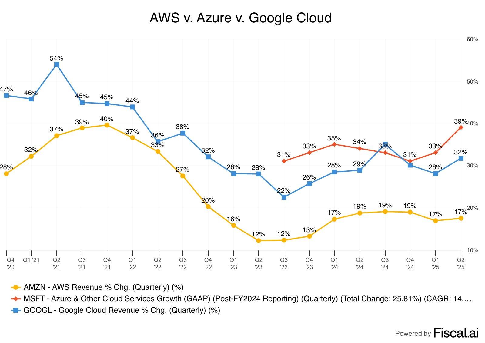云不如微软靓丽,亚麻AWS过去12个月收入116bn,增速17%,Azure 大概76bn,增速40%,被微软完爆了,照这个速度微软超越也就是1-2年的时间 $微软(MSFT)$