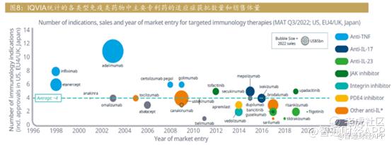 修美乐之后,免疫领域新靶点争相涌现(白介素类、JAK/Tyk2抑制剂等),且专利药物数量也远多过TNFα三国时代,单款专利药的适应症数量也很难超过8种,说明在后一阶段的临床及商业化竞争中,市场愈加白热化,临床上精准治疗的理念逐渐加深。