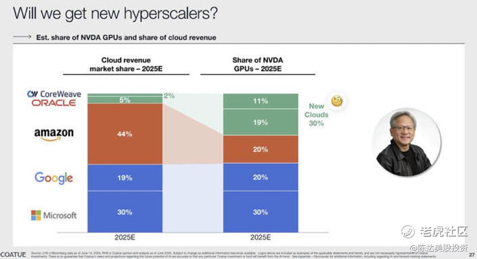 达子以外,其他的几个,不赘述,但我只想提醒一点,市场现在对AI的情绪用甚嚣尘上、人声鼎沸、巴巴劫劫来形容,贴切不过。比如Coatue 的一个数据很说明问题,谁能拿到达子卡的份额,谁在云计算业务上就有估值溢价。Amazon云计算体量大但是拿不到卡,财报就没那么自信,市场也报之以瀑布暴跌。在云计算一侧,达子俨然开始成为了发牌手。