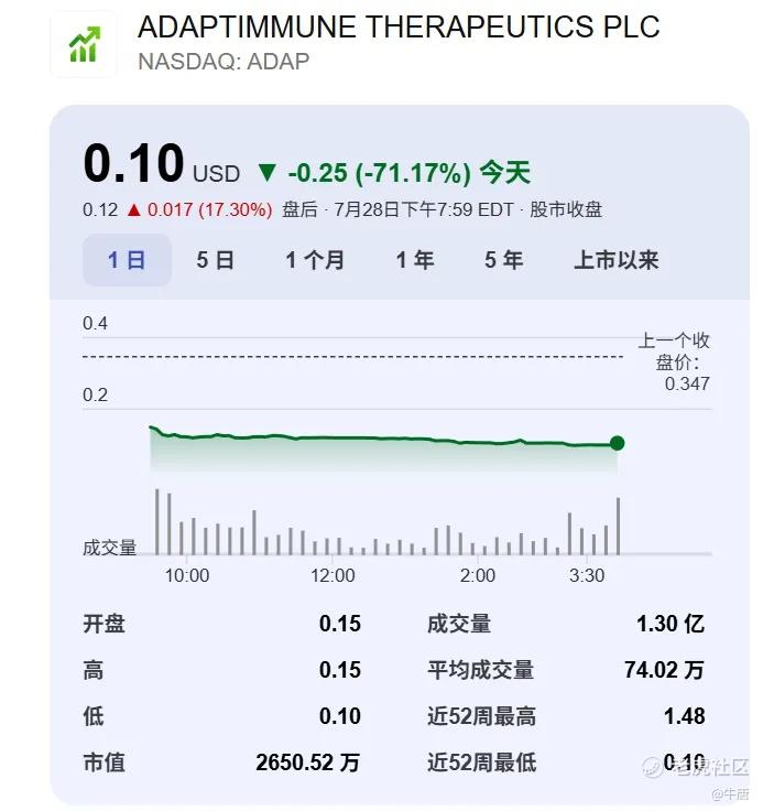 受此消息影响,在纳斯达克上市的Adaptimmune Therapeutics股价暴跌71%,市值仅剩2650万美金。