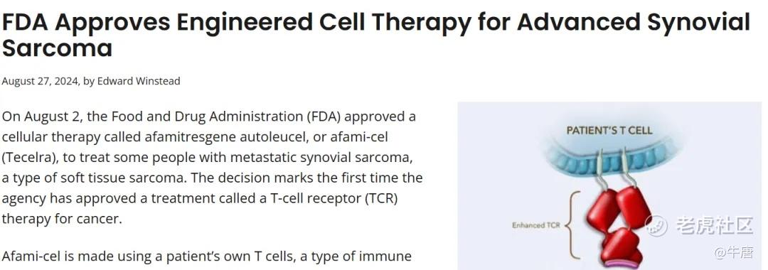 Tecelra的获批拥有多个里程碑式“第一”的意义:全球首款用于实体肿瘤的工程细胞疗法、全球首款获批上市的TCR-T细胞疗法,以及十多年来第一款用于转移性或不可切除的滑膜肉瘤的新治疗方法。