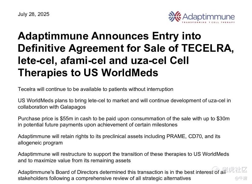 2025年7月28日,TCR-T细胞疗法领军企业Adaptimmune Therapeutics宣布了一项重大交易:以5500万美元现金首付款,以及未来最高3000万美元里程碑付款,将旗下包括已获批药物Tecelra以及处于研发阶段的lete-cel、afami-cel和uza-cel在内的四款细胞疗法,出售给USWM CT。