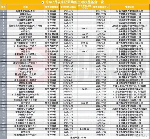 据不完全统计,截至8月9日,7月以来已有近50只主动权益基金进行了限购,其中不乏最近一年涨幅居前的绩优产品。除了中欧数字经济、中欧精选,还有包括高楠管理的永赢睿信、吴远怡管理的广发成长领航一年持有、江峰管理的中信保诚多策略灵活配置等产品。