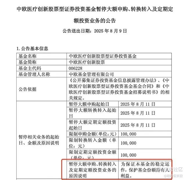 8月9日,中欧基金称,为进一步保证基金稳定运作,保护基金份额持有人利益,葛兰管理的中欧医疗创新单日单账户限购10万元。